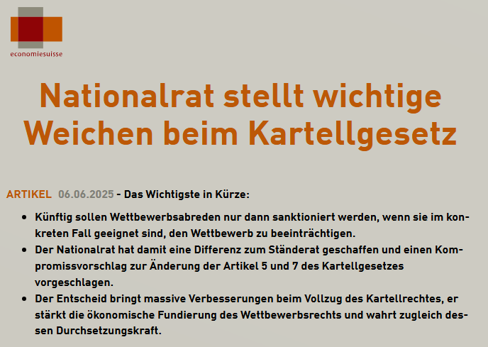 Lesen Sie diesen sehr guten Kommentar (inklusive der aufklappbaren Zusatzerläuterungen am Schluss) von Economiesuisse zum Entscheid des Nationalrats i.S. KG-Teilrevision (Klick auf Bild).